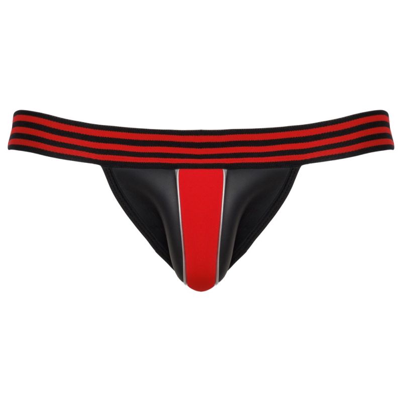 Pofreier Jock von Svenjoyment in extravaganter schwarzer Neopren-Optik mit roten Kontrasten. Breites komfortables Streifen-Bundgummi.
