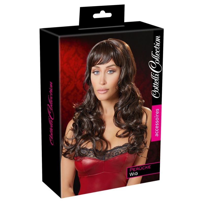 Hochwertige dunklebraune Kunsthaarperücke mit Pony und leicht gewellten Spitzen. Die Perücke ist verstellbar für einen rutschfreien Sitz.