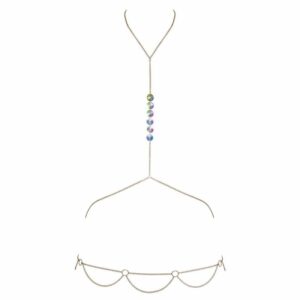 Goldfarbene Körperkette von Cottelli ACCESSOIRES mit 6 großen schillernden Hologramm-Pailletten zwischen den Brüsten. Glamouröses Schmuckstück mit Halskette, Brust- und Taillenkette sowie Hüftkette mit Kettchenbesatz und Ringen. Vielfach passend verstellbar – im Nacken und über dem Po mit Karabinerverschluss. Pur auf der Haut getragen ein stilvoll erotischer Look. Die Körperkette lässt sich auch stylisch mit Bademode oder enganliegenden Outfits kombinieren.