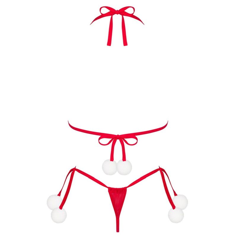 Rotes Dessous-Set Bobble Girl von Obsessive bestehend aus BH und Riostring. Weiches anschmiegsames Multistretch-Material, verziert mit weißen Plüschbommeln. BH im Nacken und im Rücken individuell zum Binden, Triangel-Cups verschiebbar. Rio mit kleinem Schmuckelement vorne, jeweils seitlich mit variablen Bindeschleifen.