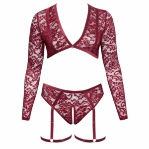 Stylisches Spitzen-Set von Cottelli CURVES mit kurzem Langarm-Top und Straps-Slip ouvert. Feine dunkelrote Spitze verführerisch in Szene gesetzt mit Samtbändern und roségoldfarbenen Accessoires. Rundum weich und elastisch für hohen Tragekomfort. Bauchfreies Top mit Herz-Schmuckanhänger im schönen V-Ausschnitt. Im Schritt verführerisch offener Taillenslip in Straps-Optik. Mit Herz-Schmuckanhänger am vorderen taillenhohen Samtband-Bund. Die Samt-Strapse mit den Schenkelriemen aus Samt sind passend verstellbar – und auch komplett abnehmbar.