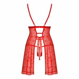 Rotes Dessous-Set Claussica von Obsessive bestehend aus Negligé und String. Feiner Stretchtüll im Schneeflocken-Design, weich und elastisch für hohen Tragekomfort. Negligé vorne an den Trägern mit weißen Plüschbommeln verziert. Hinten komplett offen mit BH-Hakenverschluss und Satin-Bindeschleife. Träger verstellbar. Zwischen den soften Cups mit kleinem Schmuckdetail.