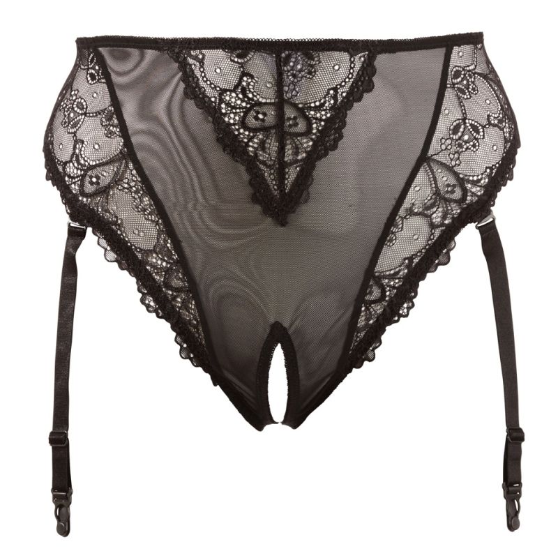 Straps-Slip ouvert aus Powernet mit floraler Spitze. Der taillenhohe Schnitt umschmeichelt Bauch und Taille. Strapse verstell- und abnehmbar. Ohne Strümpfe.