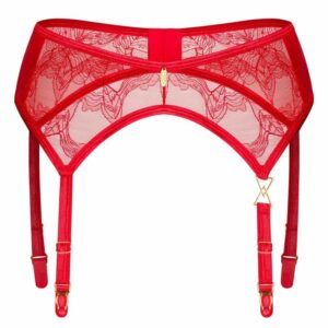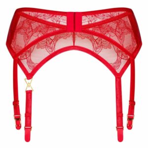 Bildschöner Strapsgürtel Aliosa von Obsessive in sinnlichem Rot aus weicher elastischer Floral-Spitze. Mit goldfarbenem Schmuckdetail am Bund und an einem Straps. Die Strumpfhalter und der Hakenverschluss im Rücken sind passend verstellbar.