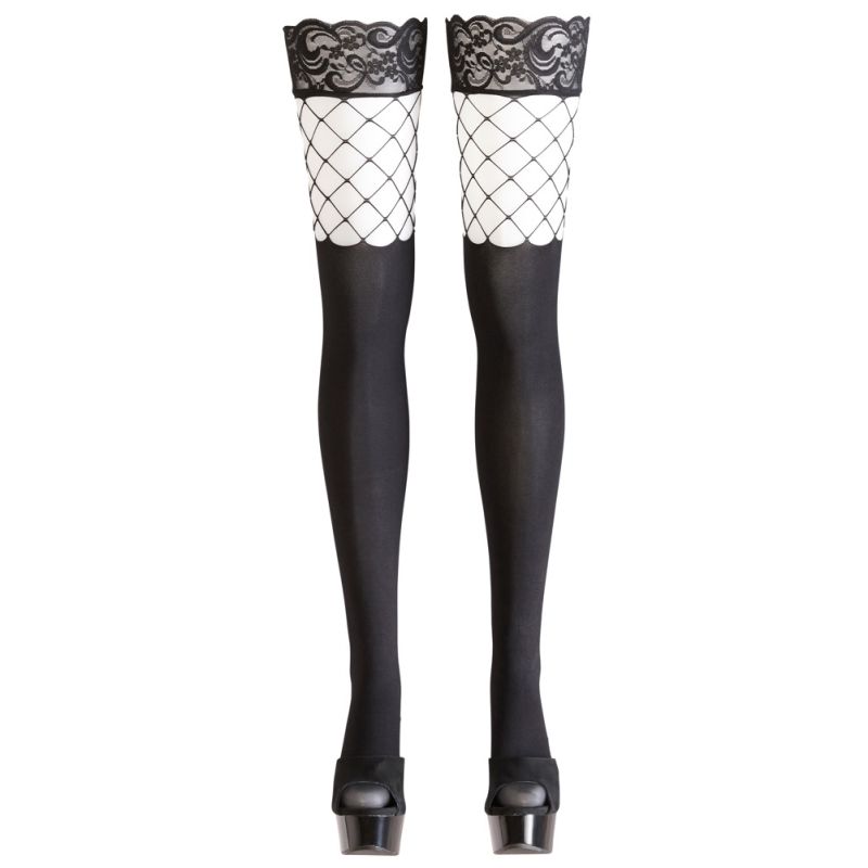 Vom Fuß bis zum Knie blickdicht, darüber aus grobem Netz. Mit silikonverstärktem Spitzenabschluss.
