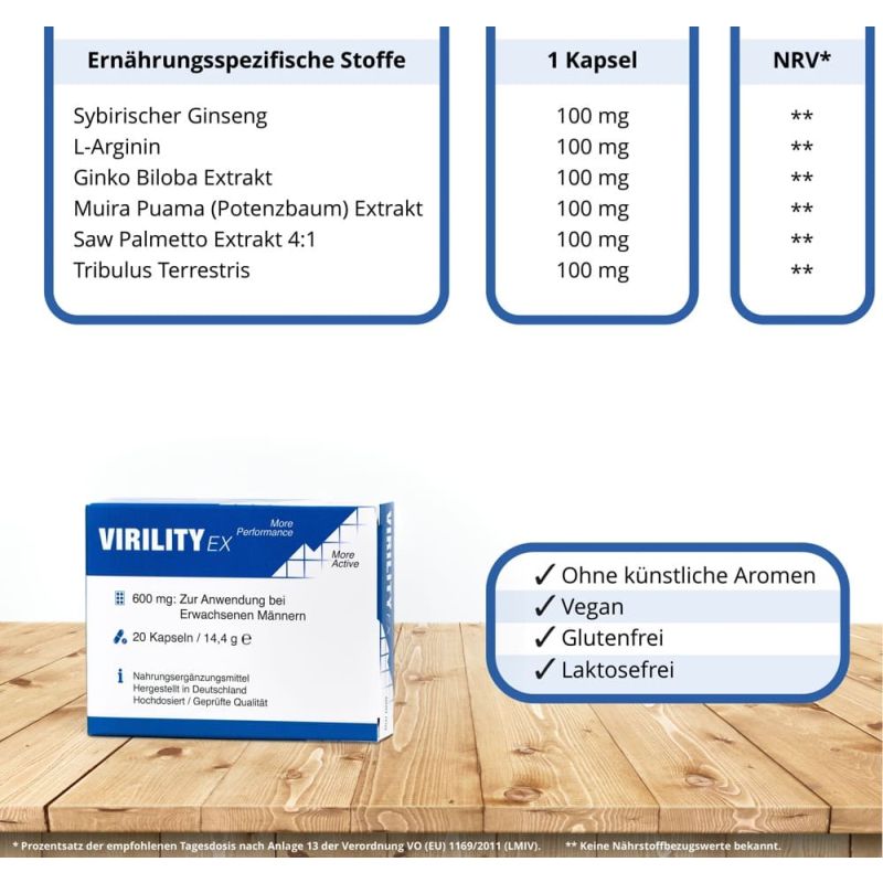 Veganes Nahrungsergänzungsmittel Virility Ex speziell für den Mann mit einer natürlichen Alternative aus ausgewählten Extrakten in einer komplexen Formel. Eine Kapsel enthält 600 mg Extraktmischung aus 6 Zutaten: