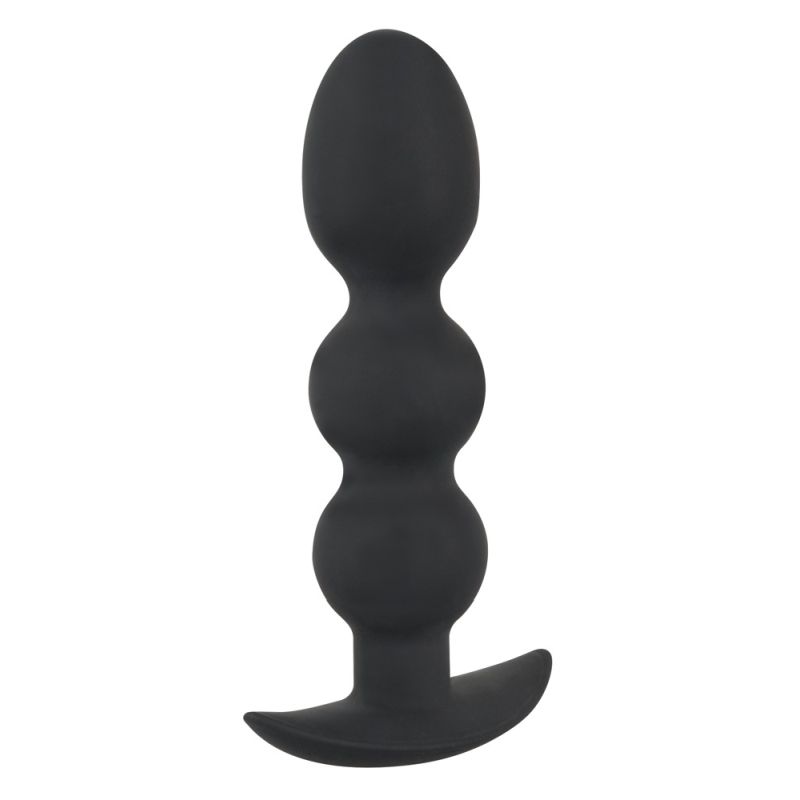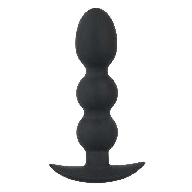 Ideal für anale Dehnspiele: Kugelplug mit breitem, sicherem Ankerfuß. Gesamtlänge 13,3 cm, Ø 1,7 bis 3,2 cm. Schwarz. Silikon mit PU-Beschichtung (Soft Touch).