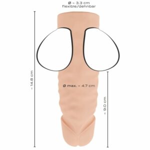 Der Ball Stretcher von Realistixxx mit Dildo stattet die Hoden mit einem zweiten Penis aus, um gleich doppelt zustoßen zu können. Der raffinierte Strap-on wird mit dem breiten Ring zuerst über die (rasierten) Testikel bis zur Peniswurzel gestreift und die Hoden dann jeweils seitlich durch die Öffnungen gezogen. Der dehnbare Ball Stretcher ist so fest, dass die gedehnten Hoden und der Dildo sicher gehalten werden, aber angenehm flexibel für ein sehr aufregendes Tragegefühl und beste Performance. Auch bei erektiler Dysfunktion ein tolles Toy für stoßfreudige Vergnügen. Es können ganz neue spezielle Orgasmen erlebt werden!