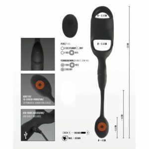 Gesamtlänge 33 cm, Einführlänge 14 cm, Vibro-Kugelplug 6,5 cm lang, Ø 4 cm; Penisring-Ø 3,5 cm, Hodenring-Ø 3,5 cm, beide dehnbar. Gewicht: 159 g. Silikon, PU, ABS.