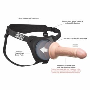 Das einfache Strap-on-System basiert auf der anatomisch gewölbten Andockplatte, in der jeder Saugfuß eines Dildos oder Vibrators (nicht beiliegend) fixiert/angedockt wird. Der Dildo/Vibrator wird in optimaler stoßfreudiger Position gehalten (Push & Play). Die innen gepolsterte Andockplatte verteilt den Druck gleichmäßig auf den Beckenbereich, sodass punktueller unangenehmer Druck vermieden wird. Bei dieser Elite-Ausführung ist für noch höheren Komfort der Rückengurt weich gepolstert und die Andockplatte aus Silikon gefertigt. Alles passt sich der Anatomie und den Bewegungen perfekt an. Die stabilen breiten Gurte sind für festen und komfortablen Sitz in der Passform mit Kunststoffgleitern verstellbar.