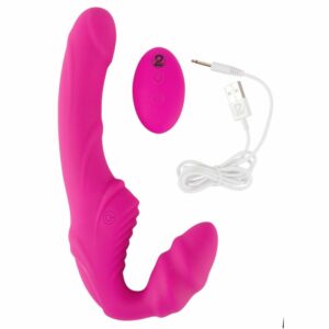 Gurtloser Strap-on mit flexiblem Doppelvibrator. Der kurze, ausgeprägt gewellte Vibrator wird in die Vagina eingeführt und durch die vaginale Muskulatur gehalten. So ausgestattet kann jetzt der Partner mit dem längeren, reizstrukturierten Vibrator verwöhnt werden. 9 abwechslungsreiche Vibrationsmodi sind dabei mit der Fernbedienung (Reichweite 5 m) bequem per Knopfdruck steuerbar. Rundum mit Soft Touch Textur überzogen, sorgt der Doppelvibrator beim Tragen und Verwöhnen für ein sehr angenehmes Hautgefühl. Wiederaufladbar – inklusive USB-Ladekabel und Batterie (CR2032) für die Fernbedienung.